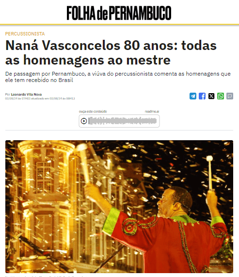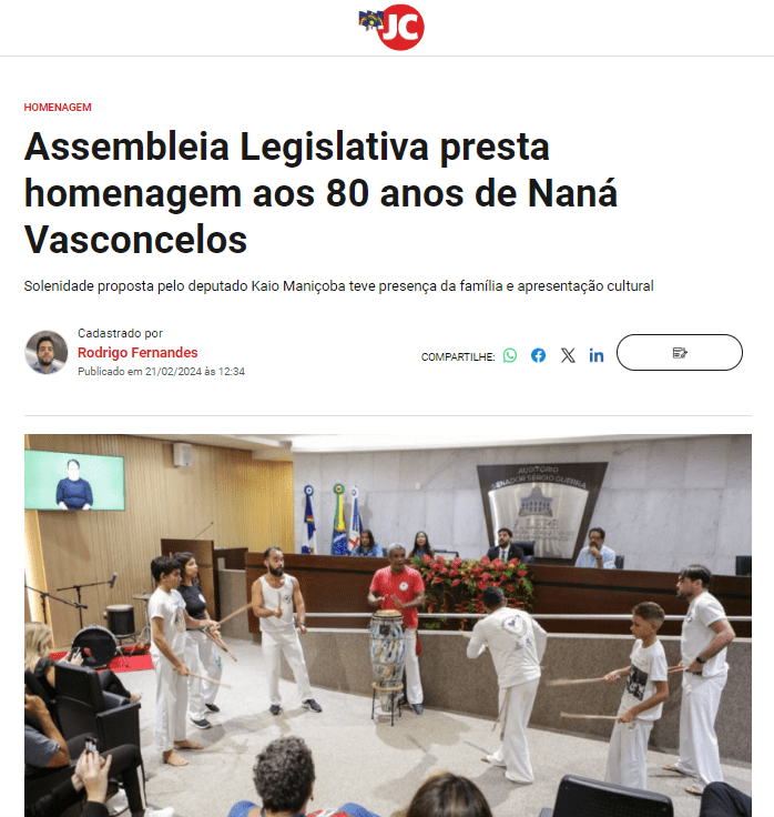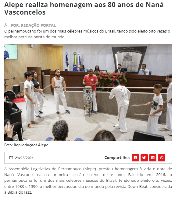 Saiba mais: https://www.cbnrecife.com/artigo/alepe-realiza-homenagem-aos-80-anos-de-nana-vasconcelos