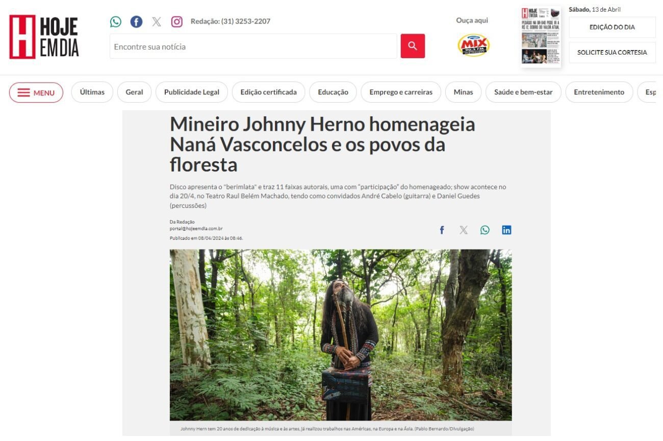 Saiba mais: https://www.hojeemdia.com.br/entretenimento/mineiro-johnny-herno-homenageia-nana-vasconcelos-e-os-povos-da-floresta-1.1008295